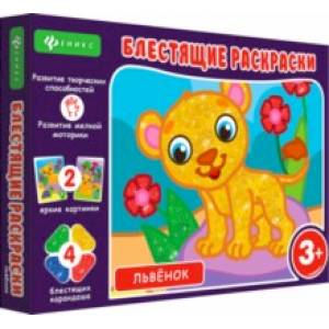 «Блестящая   раскраска» Львенок   —   картинки для   раскрашивания   глиттерными   карандашами.   Набор, помимо  весело  проведенного времени,   подарит   ребенку радость  творчества,  основы сочетания  цветов  и  работы с   глиттерами, поможет развить усидчивость,  аккуратность  и  внимательность,  а также станет отличном  тренировкой   мелкой   моторики.