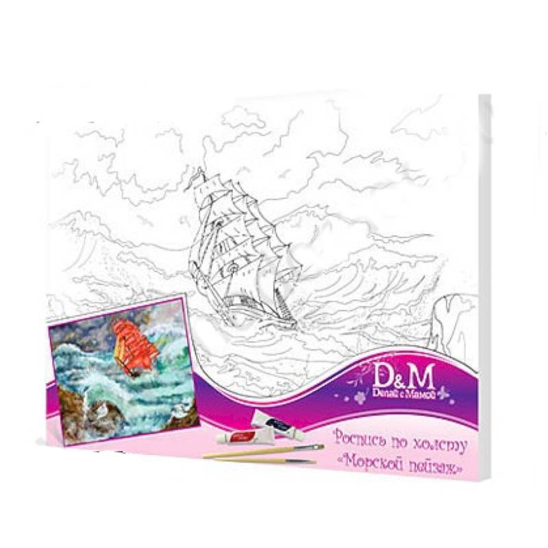 Набор для росписи по холсту. Размер холста 35 x 25 см. На холст уже нанесены контуры рисунка. Поверхность ткани обработана специальным составом, благодаря которому краски ложатся ровным слоем. Ткань выбелена. Холст закреплён на деревянной рамке - будущий шедевр можно повесить на стену В набор входит: холст с контурным рисунком на деревянной рамке; 2 кисточки; палитра для смешивания красок; краски 8-ми цветов. Для детей от 5-ти лет.