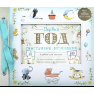 В окошко обложки можно вставить лучшую фотографию ребенка, внутри же есть конвертик для бесценных сокровищ (крохотных первых носочков или бирки из роддома) и 24 карточки с подписями и картинками для домашних фотосессий.