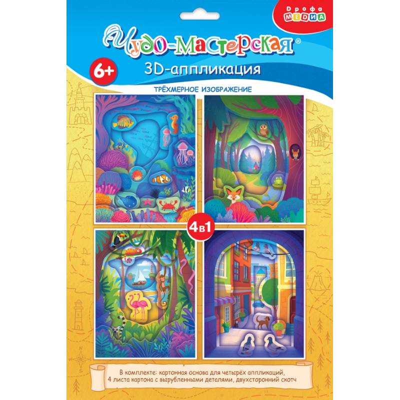 В наборе: картонная основа для четырёх аппликаций, 4 листа картона с вырубленными деталями, двухсторонний скотч.
