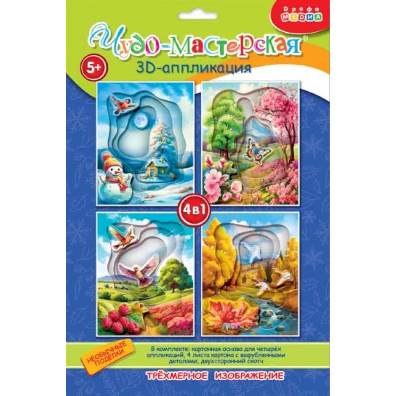 3D-аппликация - современный и очень увлекательный вид творчества. Малыш легко сделает объёмные 3D-картинки самостоятельно: слои аппликации уже вырублены, нужно только аккуратно выдавить их из основы и приклеить друг на друга объёмным двухсторонним скотчем.