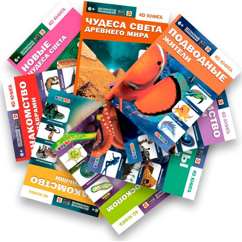 В этом комплекте вас ждет всё многообразие животных, растений, а также удивительные миры и все то, что смогло исследовать и открыть человечество. Теперь очередь за юными читателями. Для этого не нужно специального оборудования. Только ваш смартфон и бесплатное приложение DEVAR. Теперь каждый сможет погладить льва, понаблюдать за жизнью ярких моллюсков и огромных скатов, познакомиться с крошечными тихоходками и копеподами.