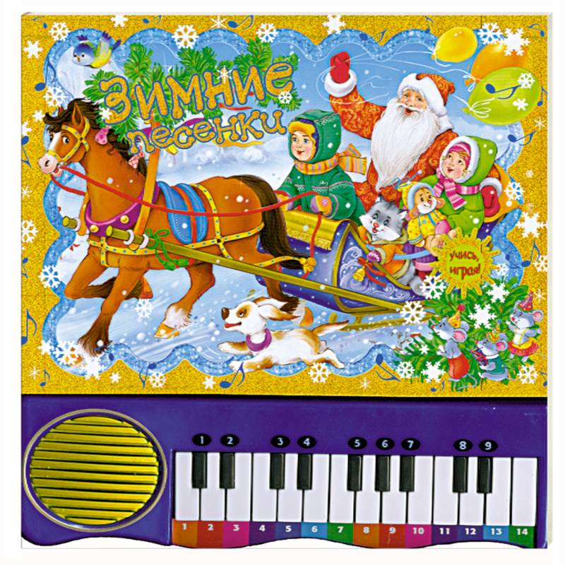 Вы найдете книжку-пианино на любой вкус, ведь 'Зимние песенки' существуют в разных вариантах оформления: традиционные новогодние красный и зелёный цвета, а также нарядные сочетания золотого и синего цветов. Книги из плотного картона с пианино, прикрепленным снизу (горизонтальное расположение; пианино работает от пальчиковых батареек), удобная запись нот, замечательные праздничные иллюстрации.