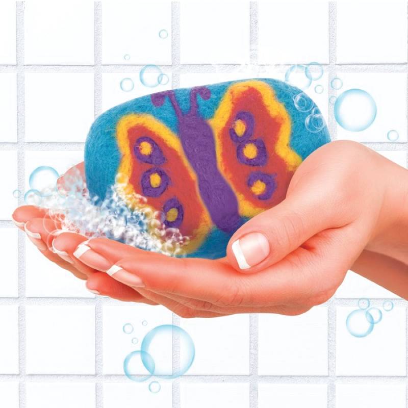 С помощью специальной иглы присоединяйте лоскуты цветной шерсти к мылу-основе и создавайте рисунок по схеме. Как это сделать, подробно описано в инструкции, а также в видео с мастер-классом (QR-код внутри упаковки).