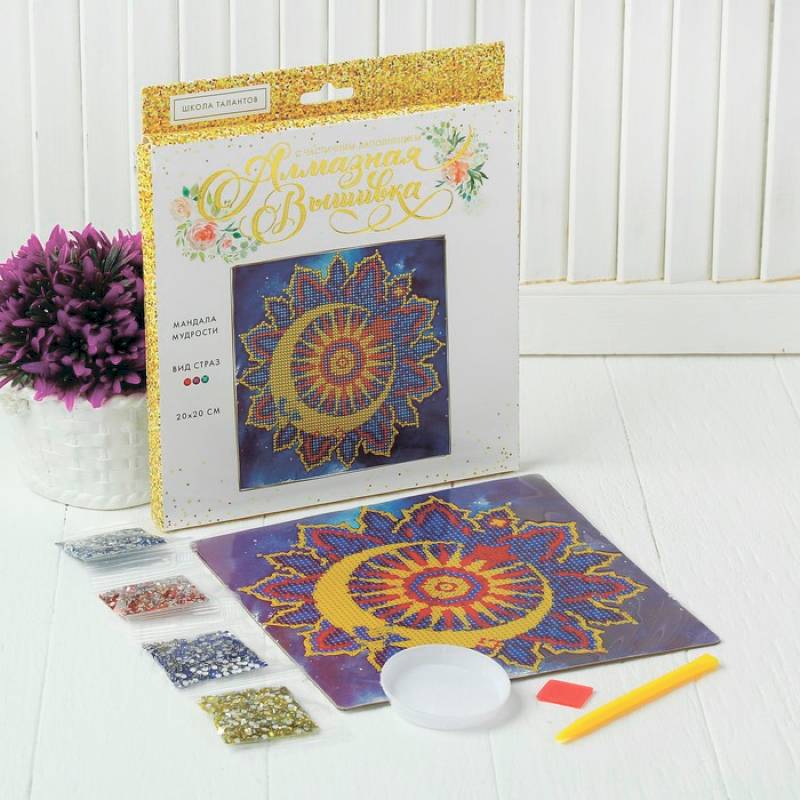 Часть картины предстоит заполнить стразами, другая часть напечатана на самом холсте — такое изделие легче и быстрее создать. Поэтому набор такого небольшого формата подойдёт для тех, кто впервые пробует свои силы в этой технике или любит быстро добиваться результата.