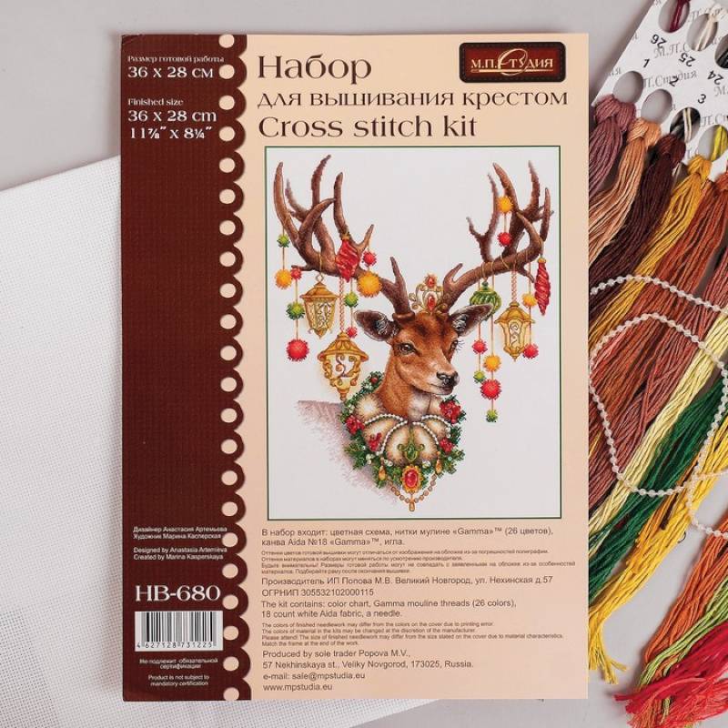 Состав: канва Аида №18, нитки мулине 26 цвета, игла, цвето-символьная схема и руководство по вышиванию.